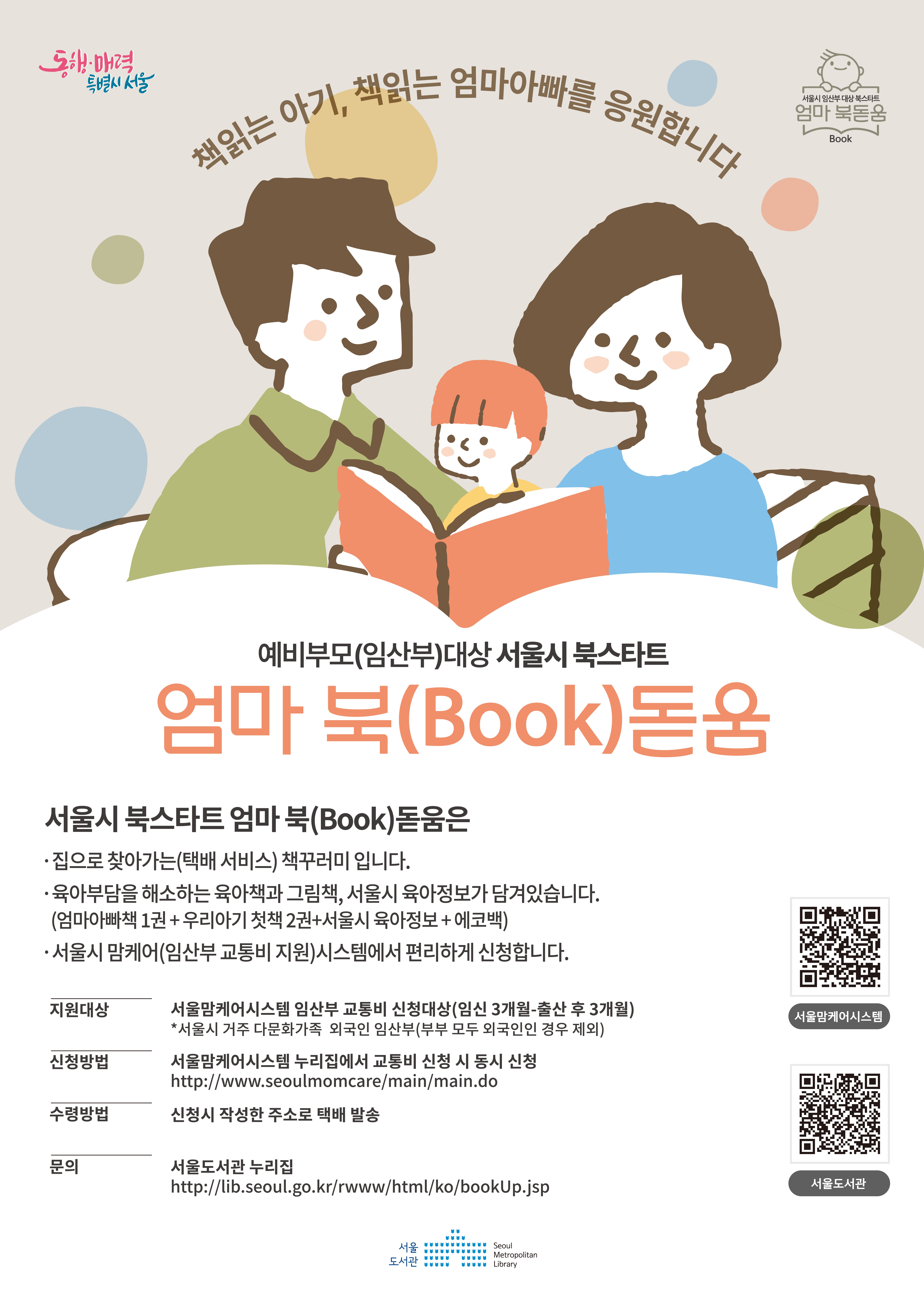 **‘엄마 북돋움’**은 서울시가 예비 부모와 영유아 부모를 위해 운영하는 무료 독서 지원 사업입니다.