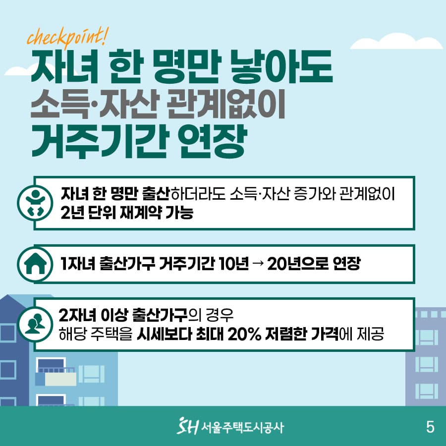 - 자녀 출산 시 거주 연장 + 우선매수권 부여